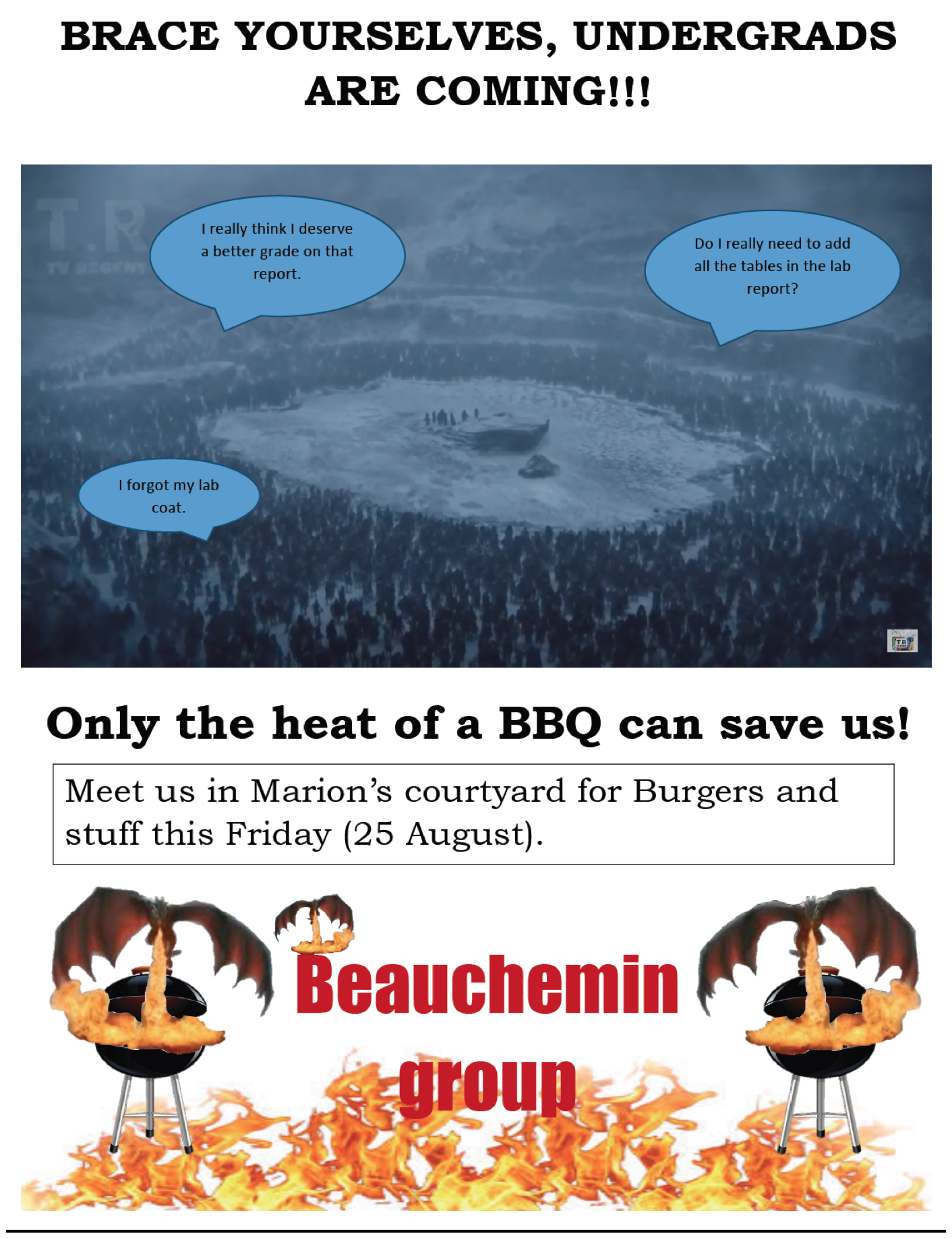 Nous avons fait équipe avec le groupe de Giorgi jeudi pour tenir le BBQ de l’association des étudiants gradués de chimie. Merci à tous!
