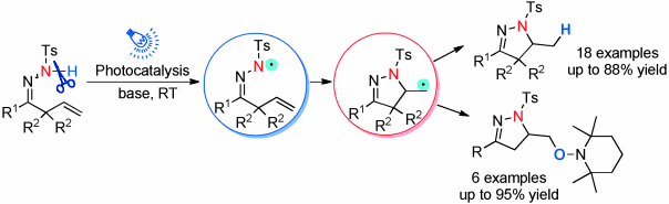 (35) “Photocatalytic Generation of N-Centered Hydrazonyl Radicals: A Strategy for Hydroamination of beta,gamma-Unsaturated Hydrazones” Hu, Q.-X.; Chen, J.-R.; Wei, Q.; Liu, F.-L.; Deng, Q.-H.; Beauchemin, A. M.; Xiao, W.-J. Angew. Chem. Int. Ed. 2014, 53, 12163–12167 [link]. (Collaboration with the Xiao research group)