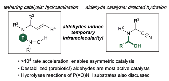 (19) “Catalysis through temporary intramolecularity: Mechanistic Investigations on Aldehyde-Catalyzed Cope-Type hydroamination lead to the discovery of a more efficient tethering catalyst” Guimond, N.; MacDonald, M. J.; Lemieux, V.; Beauchemin, A. M. J. Am. Chem. Soc. 2012, 134, 16571-16577 [link].