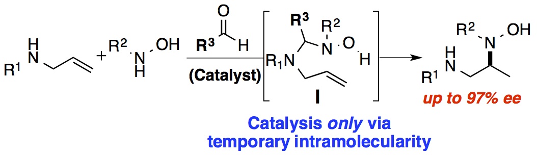 Catalysis of difficult reactions is at the base of most chemical and biochemical reactivity, and is very useful in the synthesis of nitrogen-containing molecules. Typically catalysts accelerate transformations through activation of one or both reactants. But many catalysts (e.g. enzymes) also perform pre-association and pre-organization of reagents to achieve increased reactivity and control. Despite known potential to accelerate reactions by up to 108 by pre-association, catalysts accelerating reactions ONLY through pre-association are very rare. So rare that there are hundreds of examples of reactions that use temporary intramolecularity through a stepwise process: assembly of the tether, desired reaction, cleavage of the tether. Our efforts toward intermolecular alkene hydroaminations have resulted in a catalytic strategy, enabling directed intermolecular hydroaminations to proceed at room temperature. In this work, we reported that aldehydes accelerate otherwise impossible reactions ONLY through temporary intramolecularity, and reported what is to the best of our knowledge, the first example of a highly enantioselective aldehyde-catalyzed reaction!